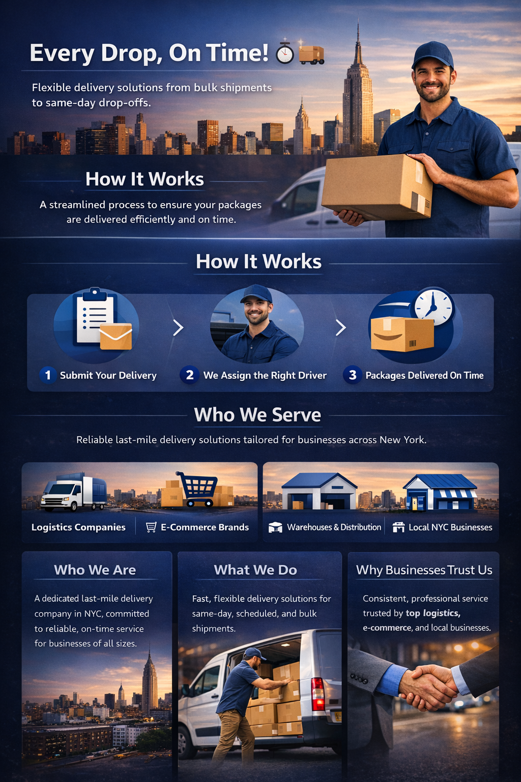 We help e-commerce brands, local businesses, and logistics partners deliver packages on time, every time β across New York.